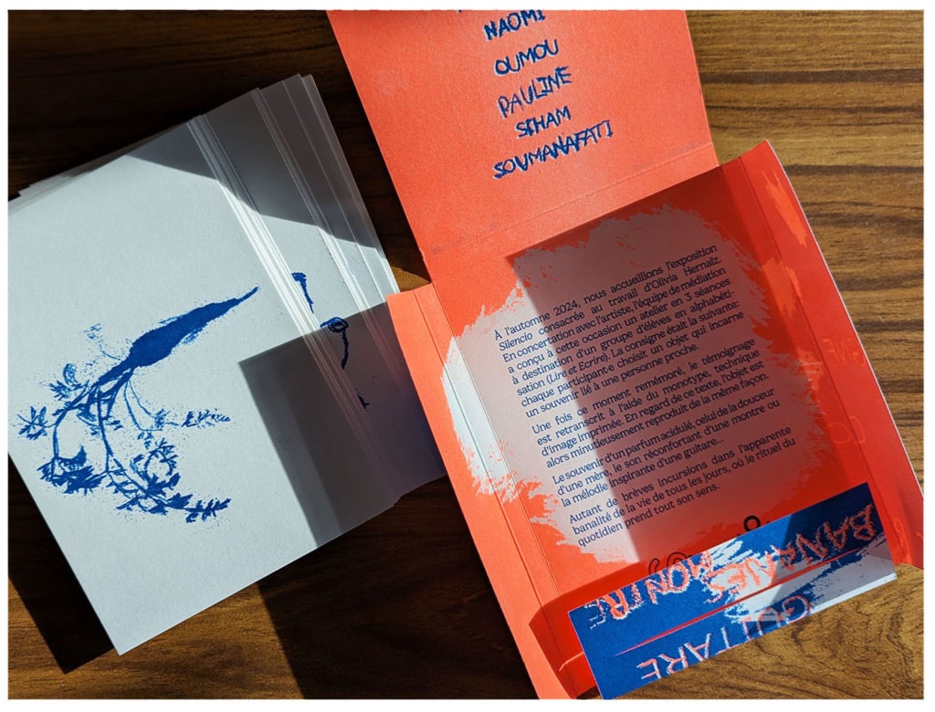 La consigne était la suivante : chaque participant·e choisit un objet qui incarne un souvenir lié à une personne qui lui est proche. Une fois ce moment remémoré, le témoignage est retranscrit à l’aide du monotype, technique d’image imprimée. En regard de ce texte, l’objet est alors minutieusement reproduit de la même façon.