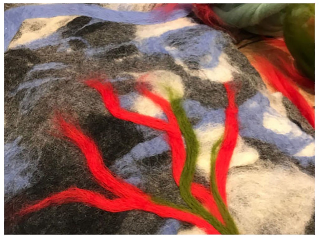 Chaque participante à cette dynamique créative a initié sa démarche par un dessin personnel, représentant un symbole qui lui tenait à cœur. Ces esquisses ont ensuite servi de modèles pour des réalisations textiles en feutre, transformant l’imaginaire du papier en matière, couleur et texture. À côté de chaque dessin de courtes phrases expliquent le choix du symbole, révélant les motivations et les émotions des créatrices. Ce carnet offre ainsi un double témoignage : celui, visuel, des dessins et du feutre, et celui, textuel, des mots qui les accompagnent. Il met en lumière le lien puissant entre imagination, création manuelle et expression personnelle, montrant ainsi comment chaque participante a pu tisser son propre univers symbolique. Les thèmes principaux qui ressortent de tout ce processus de travail sont les récits de vie, l’identité, la nature et la vie de quartier, et les réalisations qui en sont issues sont des photographies, deux carnets et des frises en feutre.